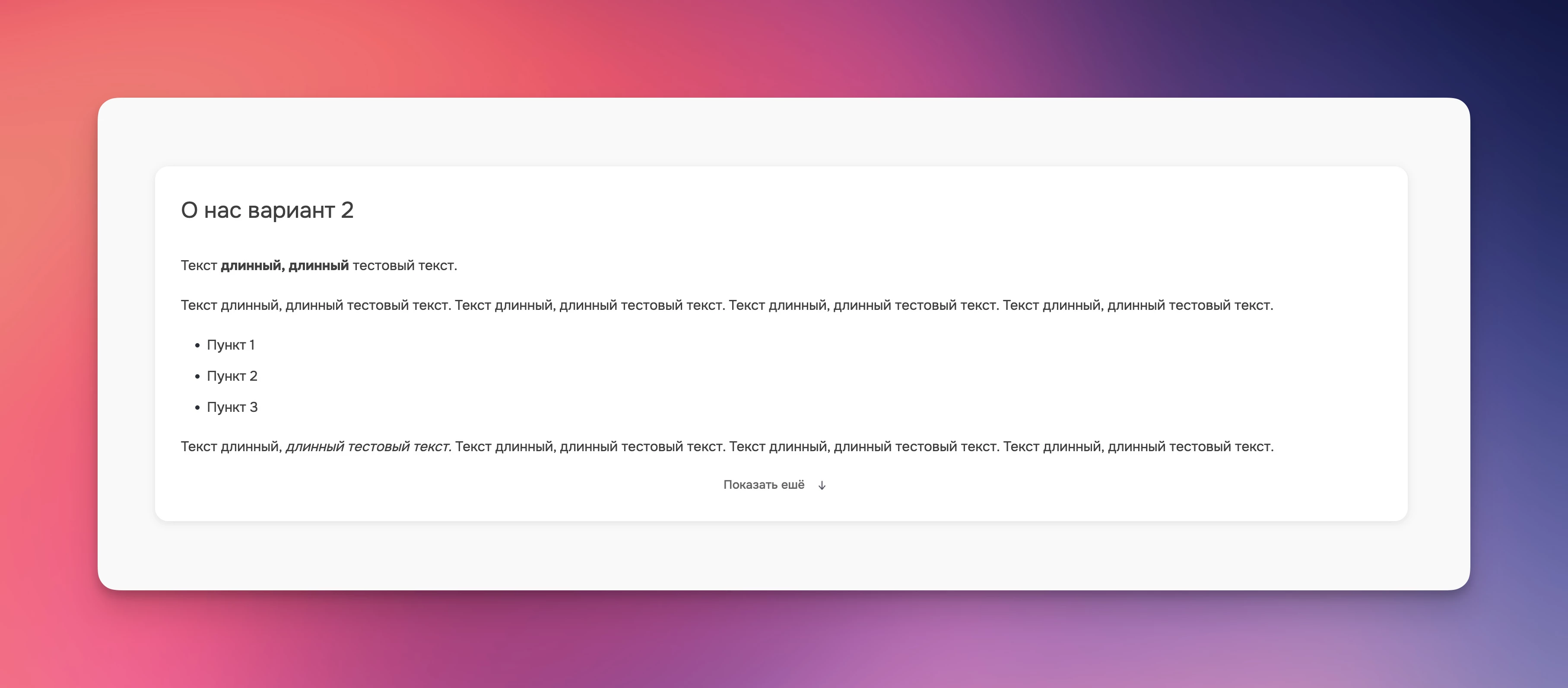 Секция предназначена для отображения информации о компании либо любого статичного текста (например SEO текста). Можно использовать обычный текст и списки. Отличительной особенностью секции является возможность скрывать текст под спойлер, а также отключать рамку блока.