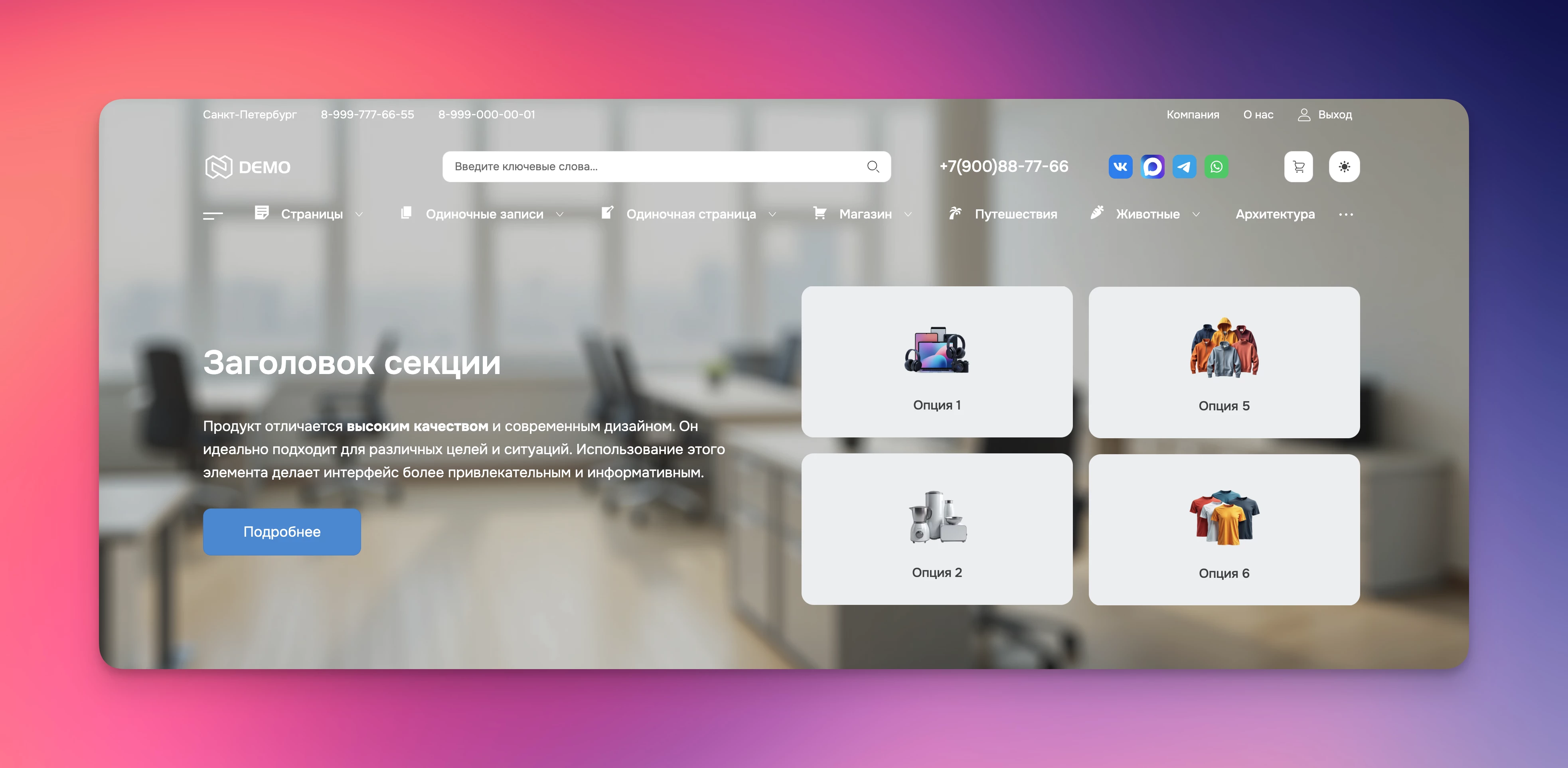 Секция приоритетно используется на первом экране сайта и рекомендуется к размещению в верхней части страницы. Позволяет выводить следующую информацию: заголовок, описание, кнопку, а также добавлять элементы (заголовок и описание) для отображения, например, преимуществ или другой дополнительной информации.