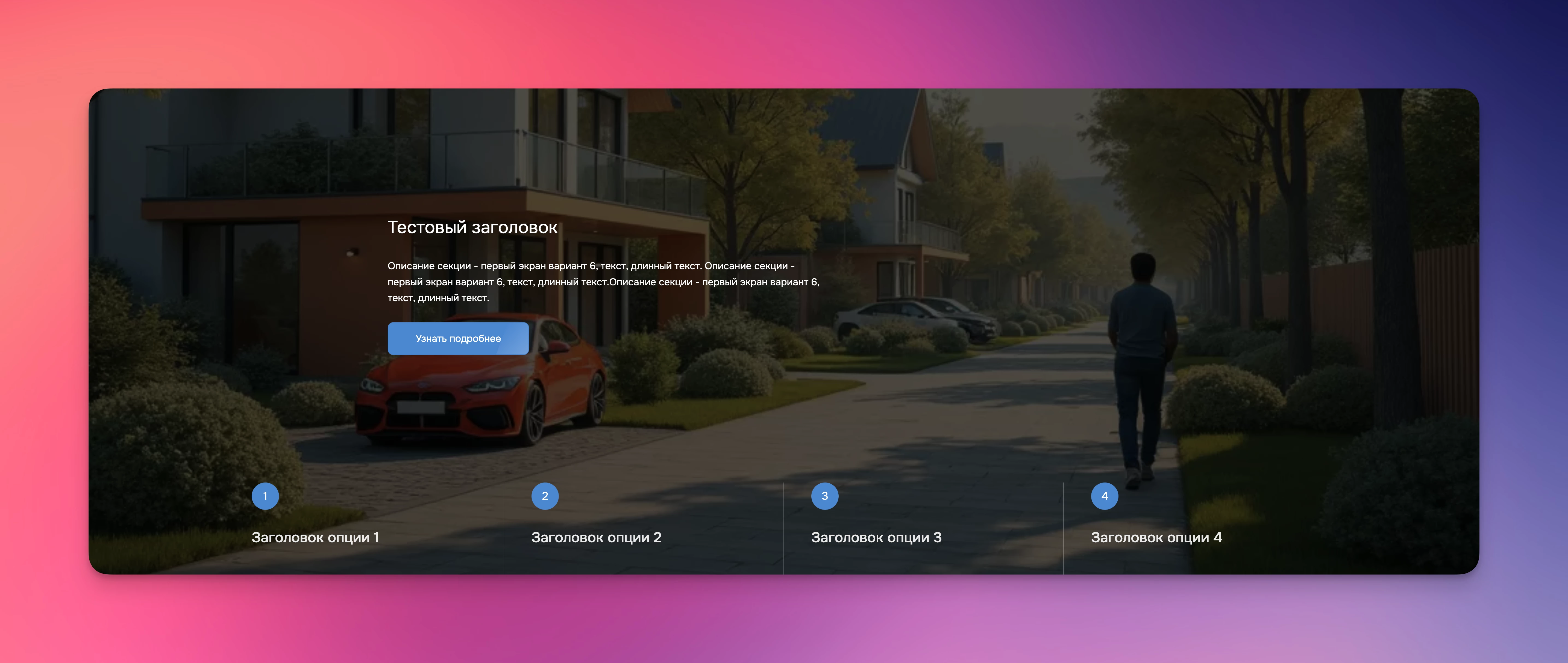 Секция позволяет выводить следующую информацию: заголовок, описание, кнопку, а также добавлять элементы (опции — например, преимущества или другую дополнительную информацию для отображения). Секцию можно размещать как на первом экране, так и между другими секциями.