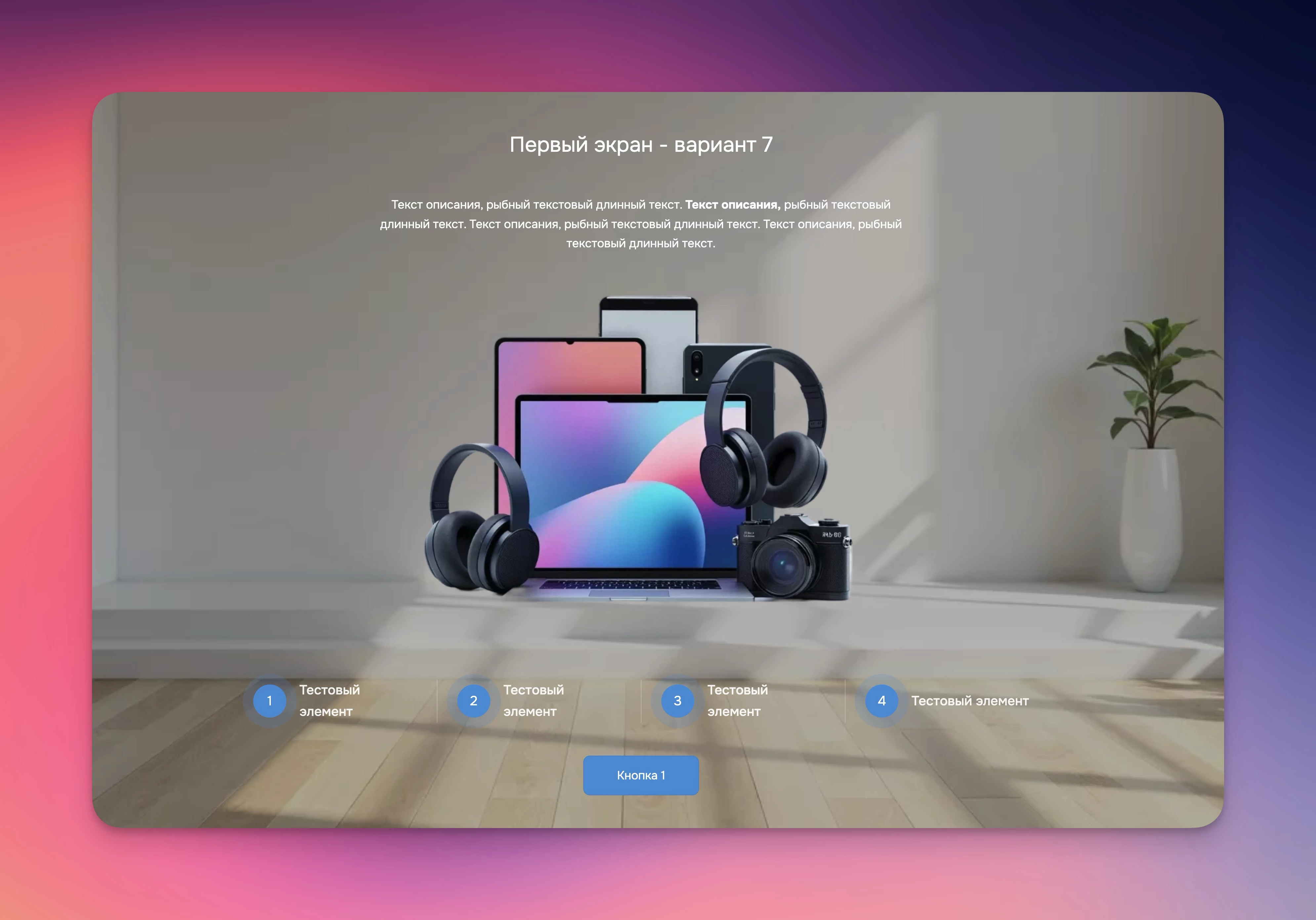 Секция позволяет выводить следующую информацию: заголовок, описание, кнопку, а также добавлять элементы (опции — например, преимущества или другую дополнительную информацию для отображения, максимально 4 элемента). Секцию можно размещать как на первом экране, так и между другими секциями.
