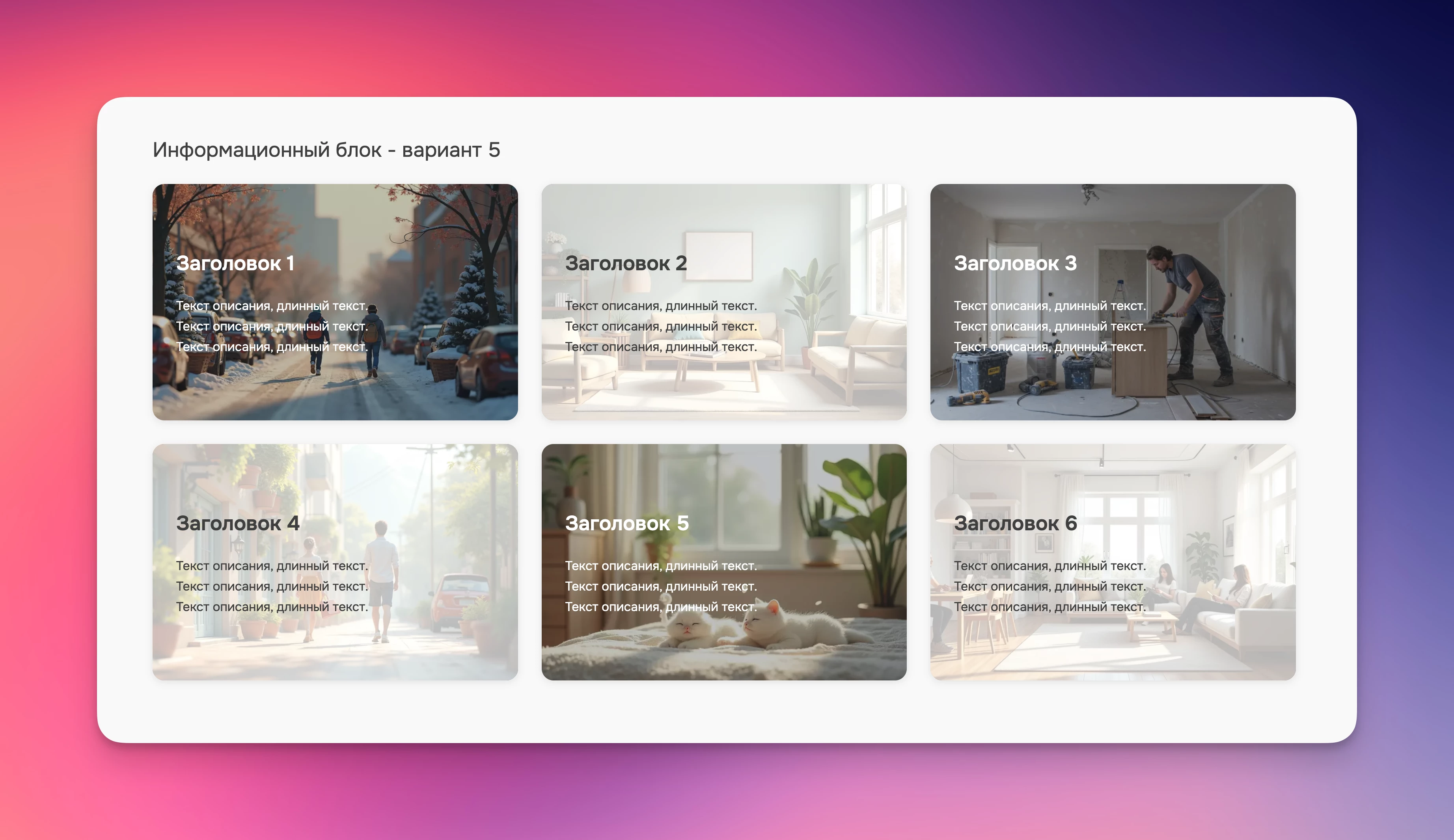Секция предназначена для отображения информации в наглядном визуальном формате. Состоит из заголовка, описания и фонового изображения. Может использоваться для отображения различной информации компактно и наглядно. Чётные и нечётные элементы секции автоматически оформляются с использованием тёмного и светлого фона для улучшения визуального восприятия.