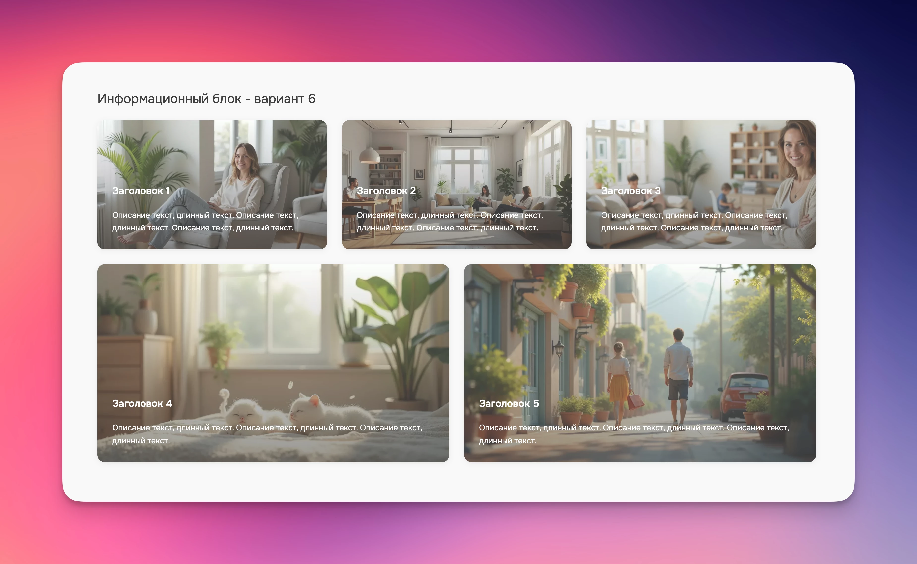 Секция предназначена для отображения информации в наглядном визуальном формате. Состоит из заголовка, описания и фонового изображения. Может использоваться для отображения различной информации компактно и наглядно. Изначально текст описания скрыт и появляется при наведении на карточку.