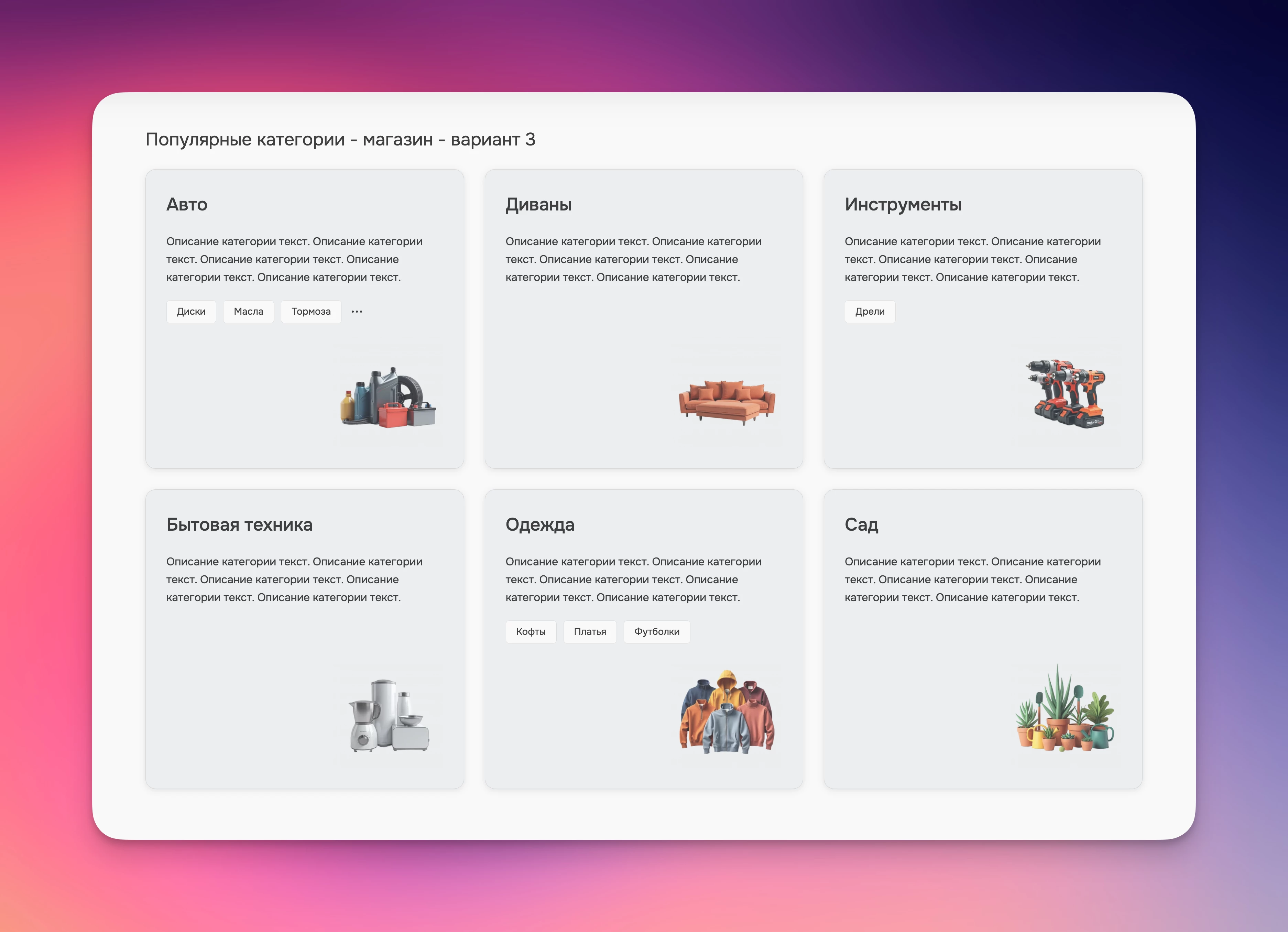 Секция выводит указанные в настройках секции категории магазина (WooCommerce).