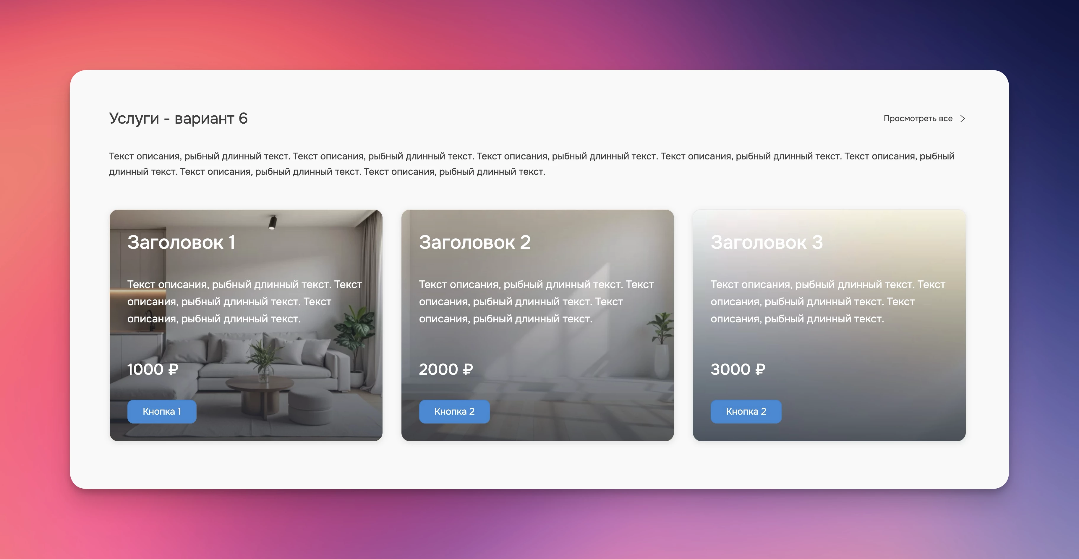 Секция предназначена для вывода информации о предоставляемых услугах. Можно добавить неограниченное количество услуг (карточек). Каждая карточка услуги включает фоновую фотографию (опционально), а также подробное описание услуги (опционально) и ссылку на её страницу (опционально).