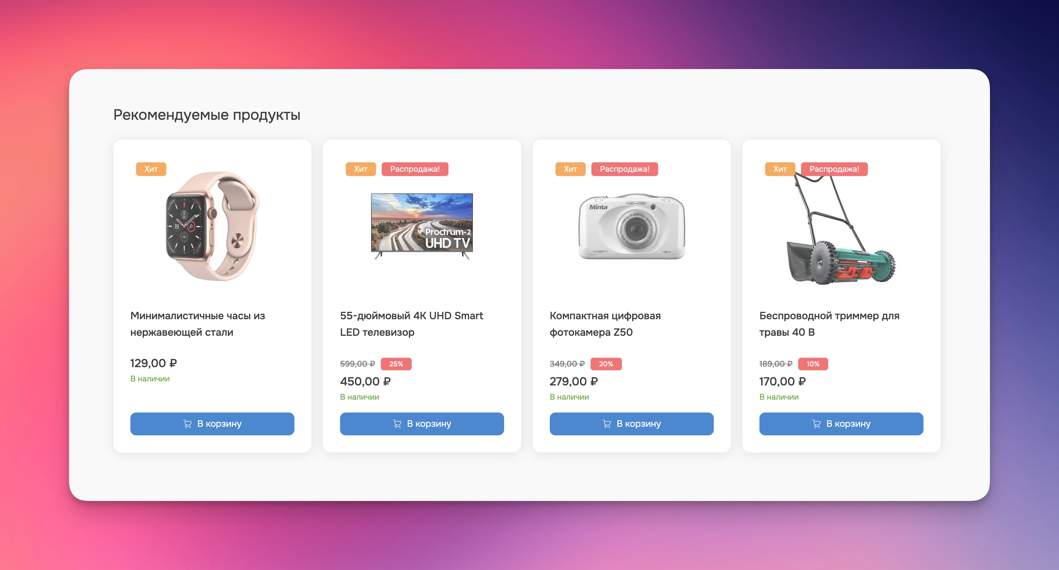 Секция предназначена для вывода рекомендуемых продуктов (требуется плагин WooCommerce). Товары в секции отображаются автоматически, если они отмечены как рекомендуемые в админ-панели и доступны на сайте.
